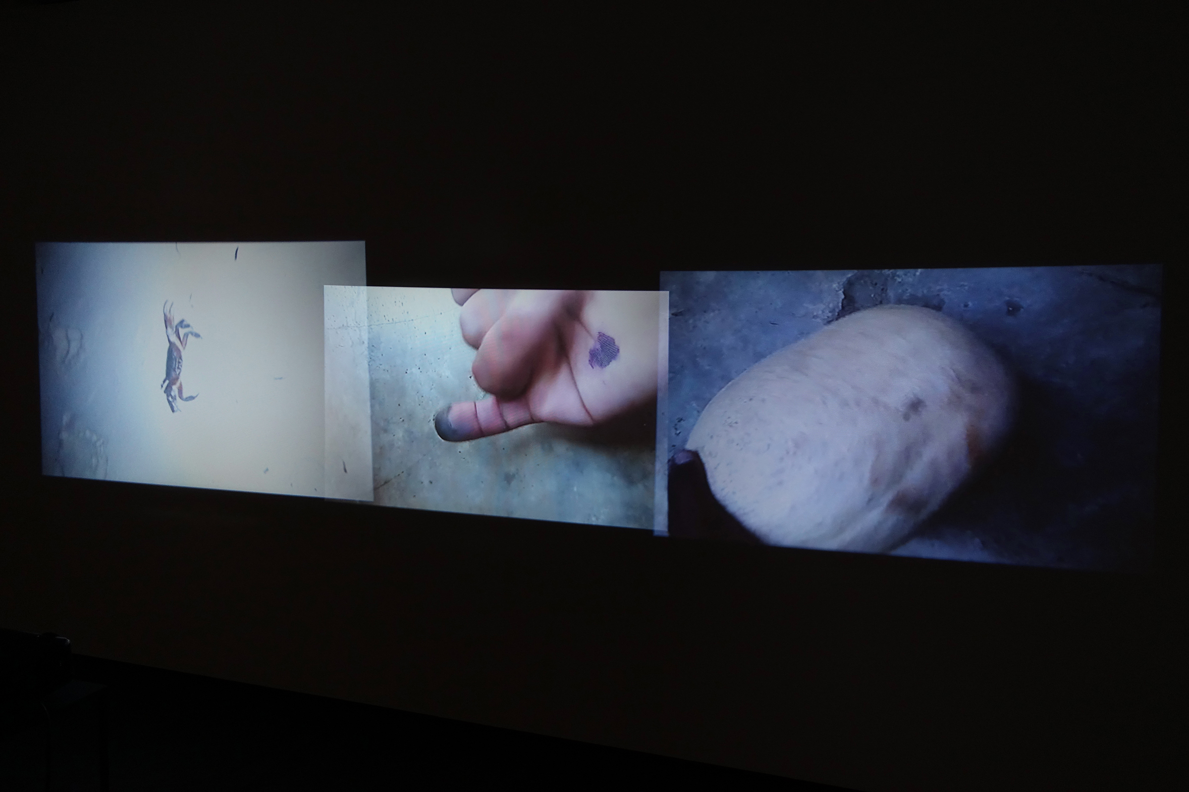 Die 3-Kanal-Videoprojektion «All over view» zeigt drei Situationen: ein Krebs, der bei einer nächtlichen Begegnung Drohgebärden macht, ein schwarz markierter Finger, nach dem Wahlgang vor die Kamera gestreckt, ein weisser Kürbis, von einer Hand gedreht und von allen Seiten präsentiert. Das Betrachten einzelner Aspekte, das Umrunden von Mikrogeschichten abseits der grossen Ereignisse, steht in dieser Arbeit für die Unmöglichkeit einer Übersicht komplexer Zusammenhänge, den Umständen, in denen sich das Leben abspielt.